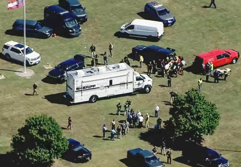 Tangkapan layar dari video yang diabadikan pada 4 September 2024 ini, menunjukkan tempat kejadian pascainsiden penembakan di Sekolah Menengah Atas Apalachee di Barrow County, Georgia, Amerika Serikat. (Sumber: WXIA)
