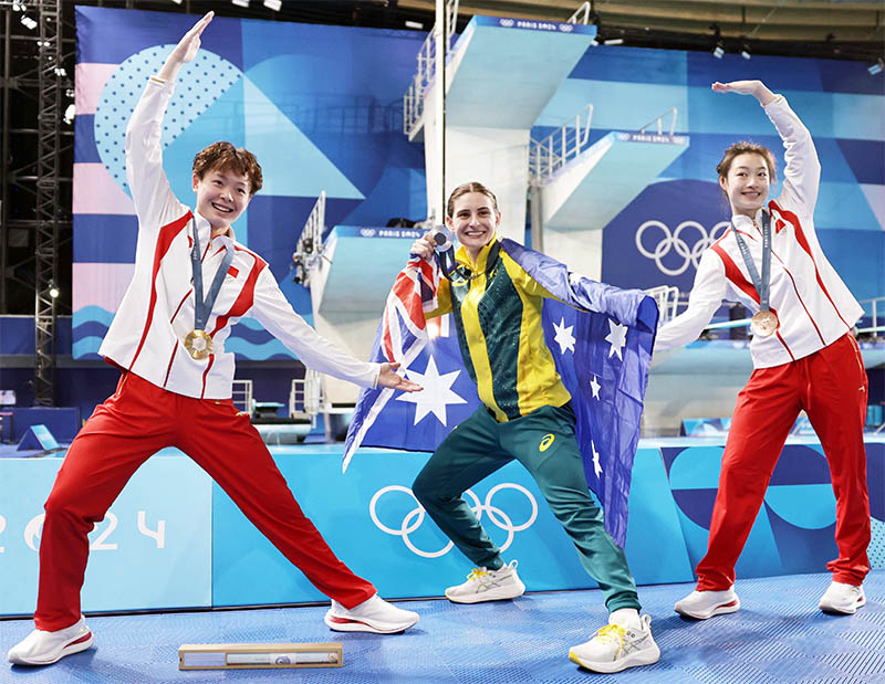 Chen Yiwen dan Chang Yani, atlet loncat indah asal China, bersama teman dekat mereka, Maddison Keeney dari Australia, menikmati kebersamaan saat ketiganya berhasil meraih podium di Olimpiade Paris, Jumat (9/8/2024).