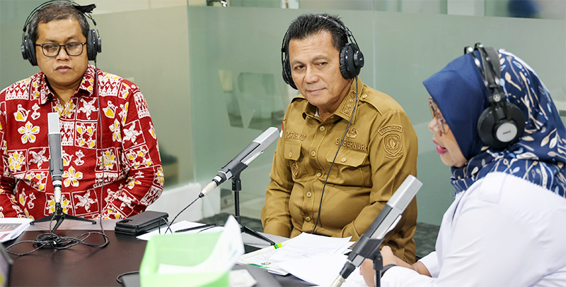 Gubkepri, Ansar Ahmad dan Ketua KPU Kepri, Indrawan Susilo Pribowoadi mengajak masyarakat ikut mengawasi pemilu bersih, jujur, dan damai dalam dialog Tanjungpinang pagi di Kantor RRI Tanjungpinang, Senin (12/2/2024) bersama Host RRI Tanjungpinang, Erita Fitrah Insani. (F. hen/ pemprov kepri)