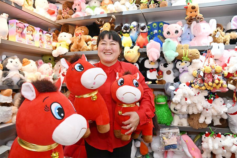 Seorang staf menunjukkan boneka “Cry-Cry Horse” di sebuah toko di Kota Perdagangan Internasional Yiwu di Yiwu, Provinsi Zhejiang, China timur, pada 12 Januari 2026. (F. Xinhua/Lyu Bin)