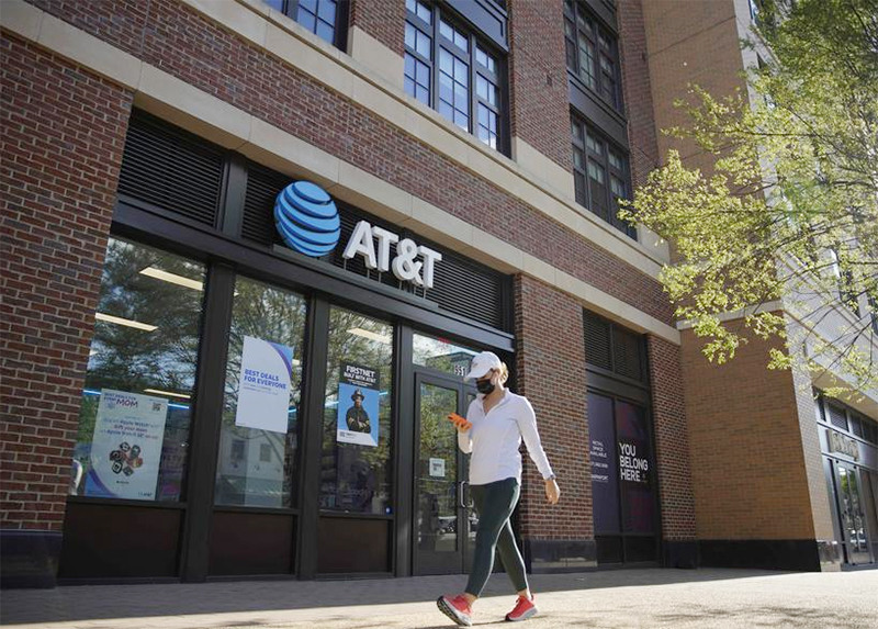 Seorang wanita berjalan melewati gerai AT&T di Washington DC, Amerika Serikat, pada 5 Mei 2021. (F. Xinhua/Ting Shen)