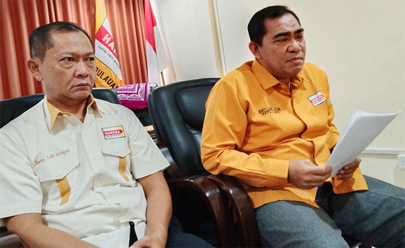 Ketua DPD Partai Hanura Provinsi Kepri, H Bakti Lubis SH MH (kanan) didampingi Plt DPC Partai Hanura Kota Batam, Amri Isti Wahyu (kiri) memberikan keterangan pers di kantor DPD Hanura Provinsi Kepri di Ruko KBC Batam Center, Senin (15/7/2024). (V. asa/ dpd hanura provinsi kepri)