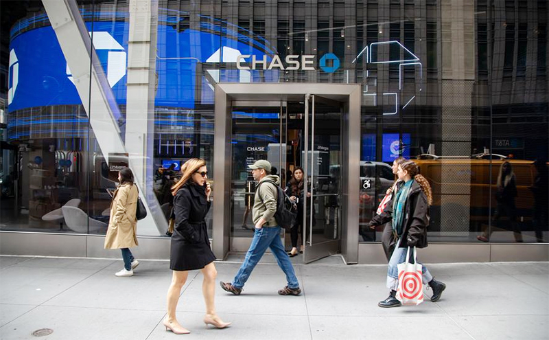 Sejumlah orang berjalan melintasi sebuah kantor cabang JPMorgan Chase Bank di New York, Amerika Serikat, pada 1 Mei 2023. (F. Xinhua/Michael Nagle)
