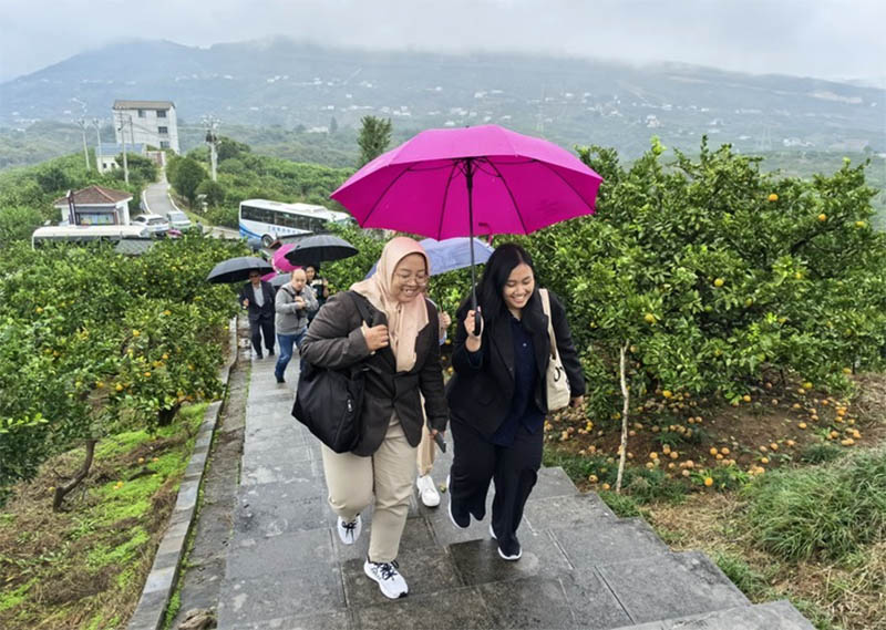 Delegasi Indonesia kemudian melanjutkan kunjungan ke perkebunan jeruk di Kota Yichang. Di Desa Guanzhuang, buah-buah jeruk bergelantungan di ranting pohon di lereng pegunungan seakan mewarnai perbukitan, pemandangan yang membuat beberapa anggota delegasi tertarik untuk memotretnya. Sambil mengundang para tamu dari Indonesia untuk mencicipi jeruknya, seorang staf dengan bangga menjelaskan bahwa jeruk dari daerah tersebut terkenal memiliki rasa manis dan kandungan air yang tinggi, sehingga berhasil menembus pasar Eropa.