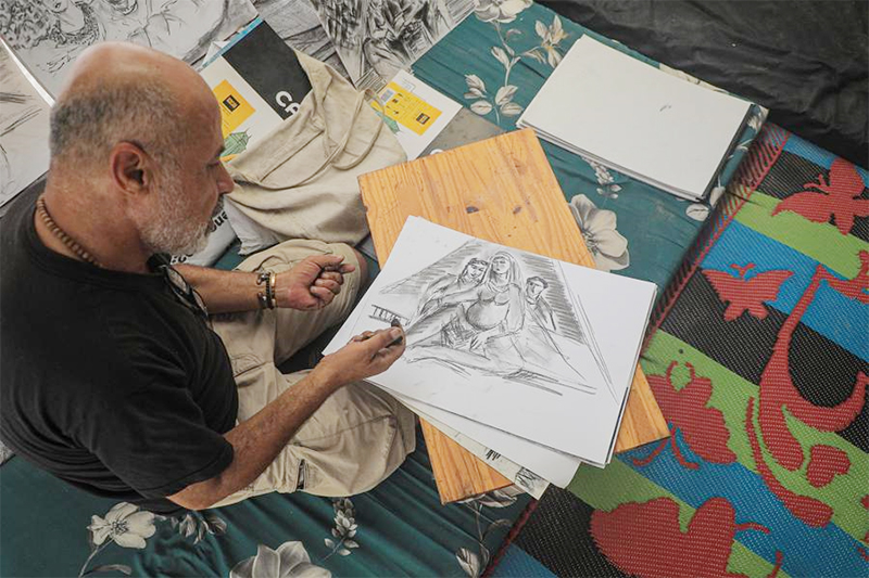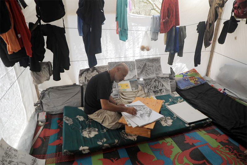 DI sudut kecil sebuah tenda pengungsi dengan dikelilingi jemuran pakaian yang bergelantungan dan kantung-kantung berisi barang kebutuhan sehari-hari, seniman Palestina Basel al-Maqousi duduk di atas kasur tipisnya menggambar di sebuah buku sketsa besar.