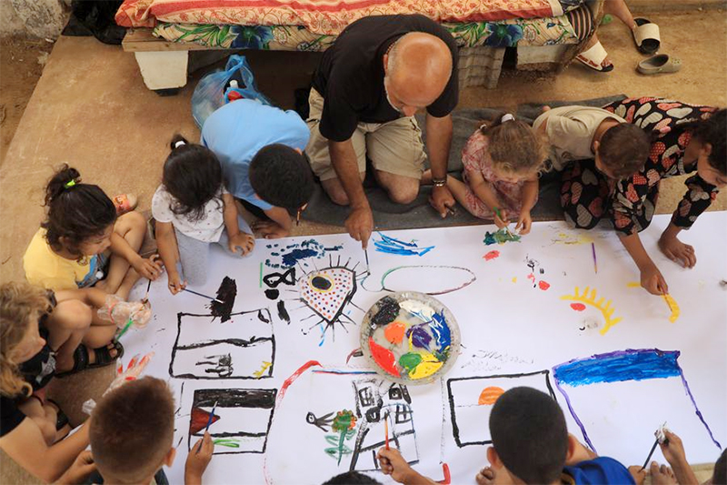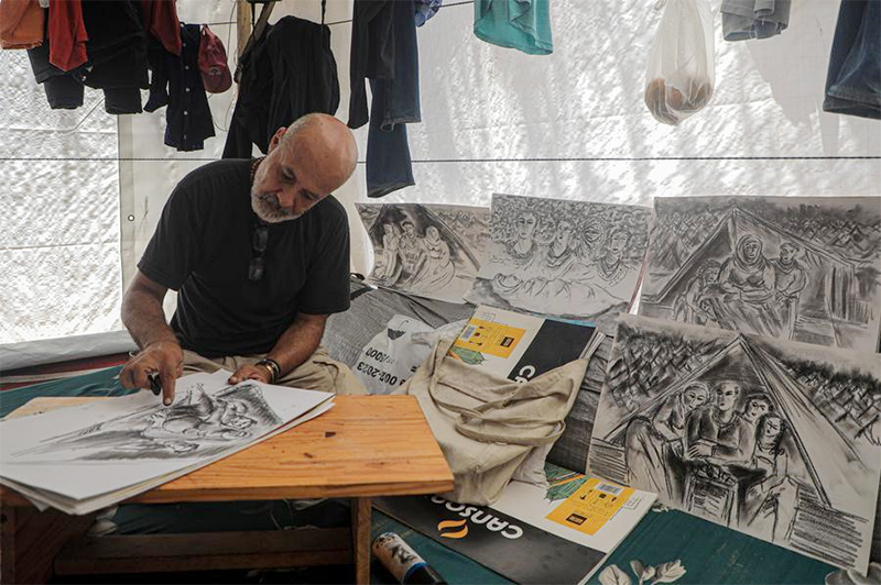 Dari satu halaman ke halaman berikutnya, tangannya dengan gesit melukis potret keluarga pengungsi yang berkumpul di bawah tenda penampungan mereka.