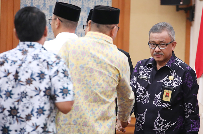 Sekdako Batam, Jefridin Hamid MPd menyalami pimpinan DPRD Batam usai rapat paripurna tanggapan Walikota Batam atas pandangan umum fraksi-fraksi pada Ranperda Perubahan APBD Batam tahun 2024 di ruang rapat utama DPRD Batam, Kamis (18/7/2024). (F. rud/ dprd batam)
