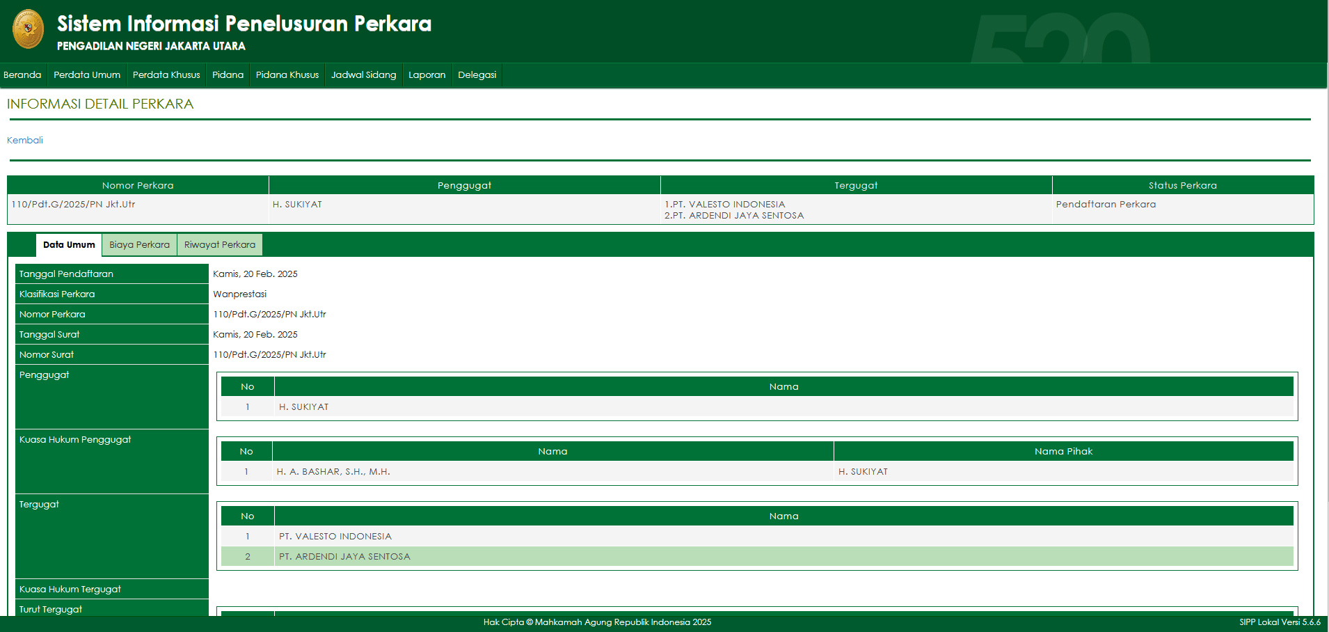 Setelah melakukan upaya somasi kedua kalinya, demikian rilis tersebut, H Sukiyat secara resmi mengajukan gugatan perdata di Pengadilan Negeri Jakarta Utara (PN Jakut) dengan Nomor Perkara 110/Pdt.G/2025/PN Jkt.Utr.