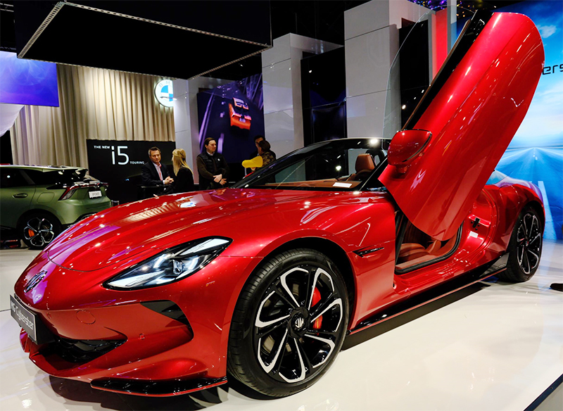 Seorang pria mengamati kendaraan listrik MG di ajang Swedish eCarExpo 2024 di Stockholm, Swedia, pada 2 Februari 2024. (F. Xinhua/Patrick Ekstrand)