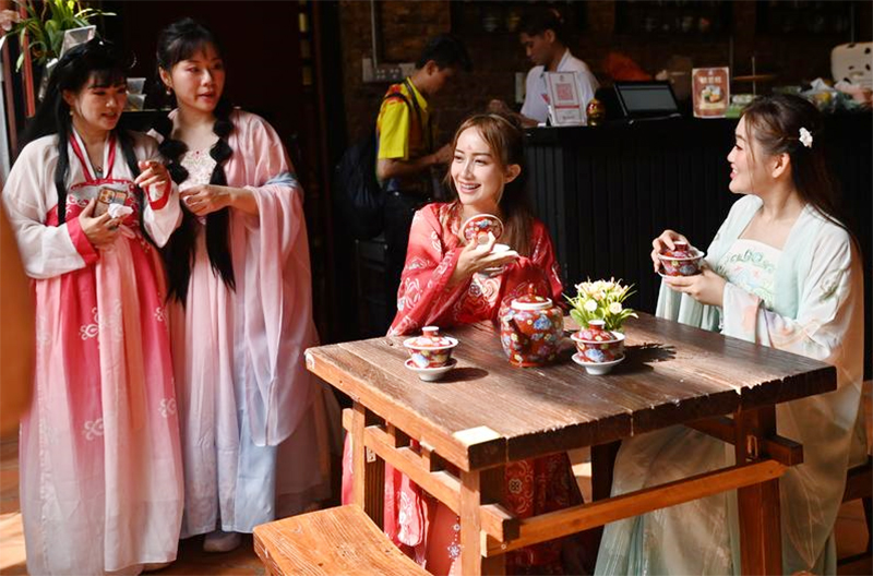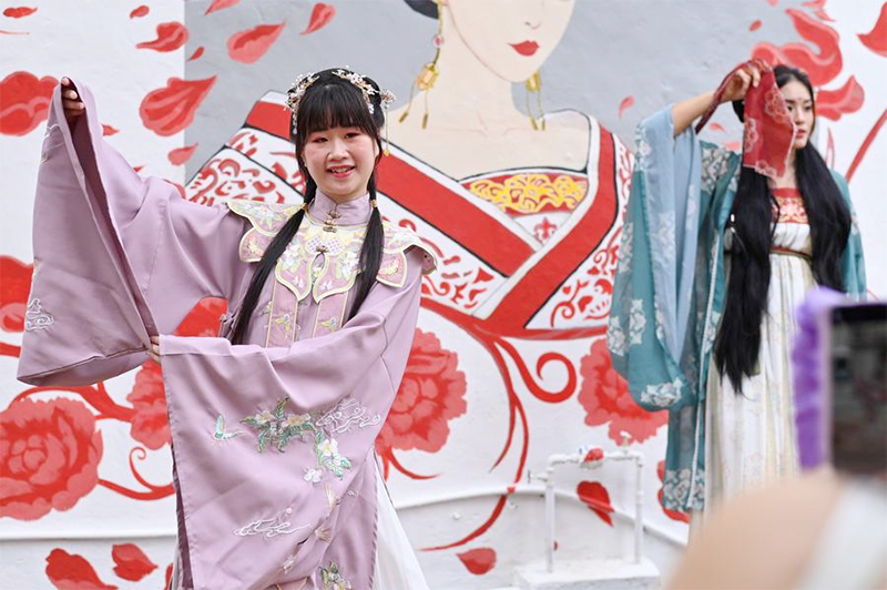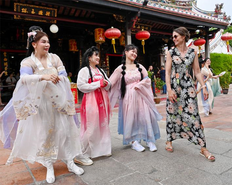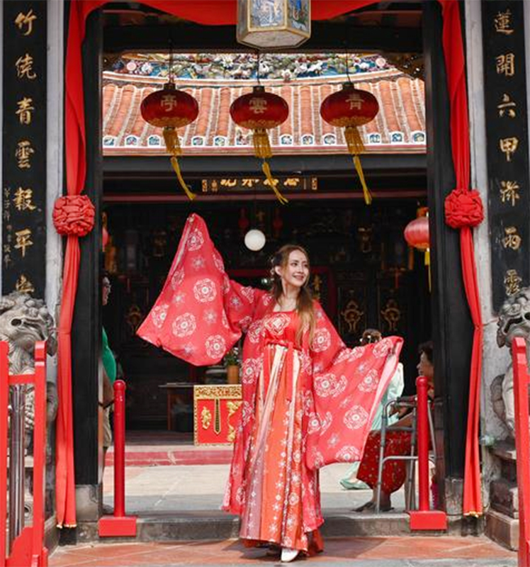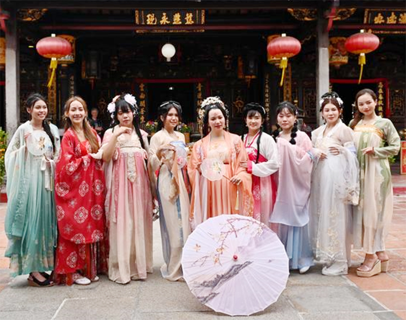 Para penggemar Hanfu berkumpul di Jonker Street, sebuah tempat wisata terkenal di Malaka, berpartisipasi dalam festival Hanfu Malaka yang pertama kali digelar. Setelah tampil, para peserta berfoto menunjukkan pesona unik busana Han China. (asa/ xinhua-news.com)