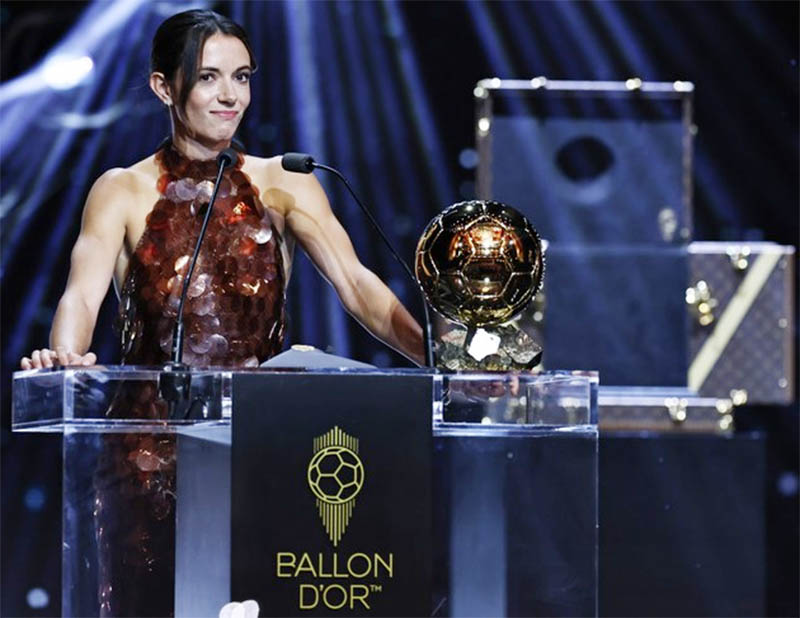Gelandang Barcelona asal Spanyol ,Aitana Bonmati berpidato di atas panggung saat menerima penghargaan Ballon d’Or untuk kategori putri dalam upacara penganugerahan Ballon d’Or France Football 2025 di Theatre du Chatelet, Paris, Prancis, pada 22 September 2025. (F. Xinhua/Gao Jing)