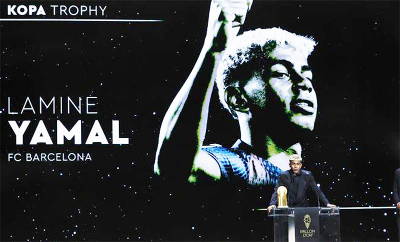 Pemain Barcelona asal Spanyol, Lamine Yamal menyampaikan pidato setelah menerima Trofi Kopa untuk kategori pemain terbaik di bawah usia 21 tahun dalam upacara penganugerahan Ballon d’Or France Football 2025 di Theatre du Chatelet, Paris, Prancis, pada 22 September 2025. (F. Xinhua/Gao Jing)