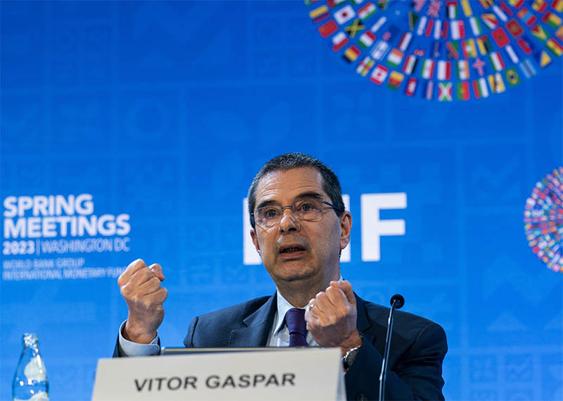 Vitor Gaspar, Direktur Departemen Urusan Fiskal Dana Moneter Internasional (IMF), berbicara dalam konferensi pers di Washington DC, Amerika Serikat, pada 12 April 2023. (F. Xinhua/Liu Jie)