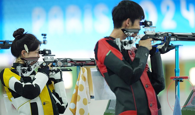Pasangan atlet menembak China Huang Yuting (kiri)/Sheng Lihao tampil dalam babak kualifikasi nomor senapan angin 10 meter tim campuran di Olimpiade Paris 2024 di Chateauroux, Prancis, pada 27 Juli 2024. (F. Xinhua/Ju Huanzong)