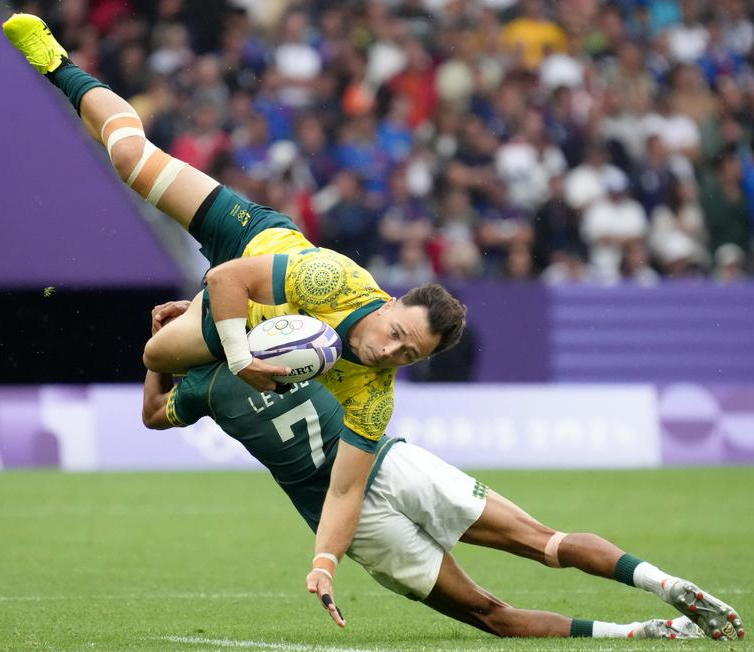 Pemain tim Australia, Hayden Sargeant (atas) berduel dengan Tristan Leyds dari Afrika Selatan, dalam pertandingan perebutan medali perunggu cabang olahraga rugbi tujuh orang (rugby sevens) putra antara Afrika Selatan melawan Australia di Olimpiade Paris 2024 di Stade de France di Paris, Prancis, pada 27 Juli 2024. (F. Xinhua/Lui Siu Wai)