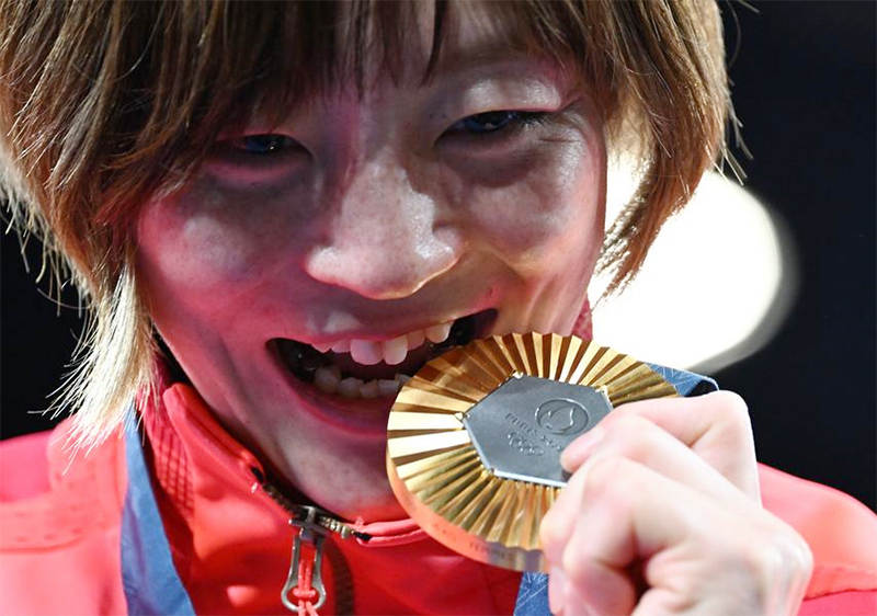Peraih medali emas Natsumi Tsunoda dari Jepang, menggigit medalinya saat upacara penyerahan medali cabang olahraga judo kelas 48 Kg putri di Olimpiade Paris 2024 di Paris, Prancis, pada 27 Juli 2024. (F. Xinhua/Wu Wei)