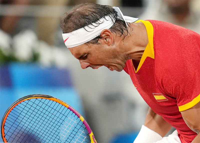 Petenis Spanyol, Rafael Nadal bereaksi saat pertandingan babak pertama ganda putra di Olimpiade Paris 2024 di Stade Roland-Garros di Paris, Prancis, pada 27 Juli 2024. (F. Xinhua/Wan Xiang)
