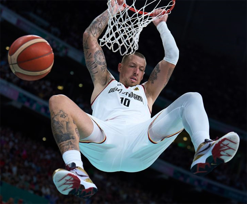Pebasket Jerman, Daniel Theis tampil dalam pertandingan grup B putra antara Jerman melawan Jepang di Olimpiade Paris 2024 di Stadion Pierre Mauroy di Lille, Prancis, pada 27 Juli 2024. (F. Xinhua/Meng Dingbo)