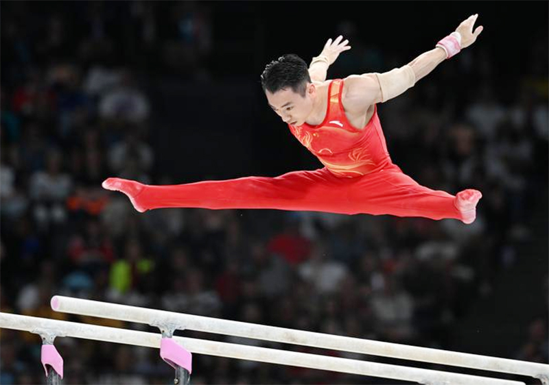 Atlet China, Zou Jingyuan berlaga dalam pertandingan babak kualifikasi cabang olahraga senam artistik nomor palang sejajar (parallel bars) putra di Olimpiade Paris 2024 di Bercy Arena di Paris, Prancis, pada 27 Juli 2024. (F. Xinhua/Cheng Min)