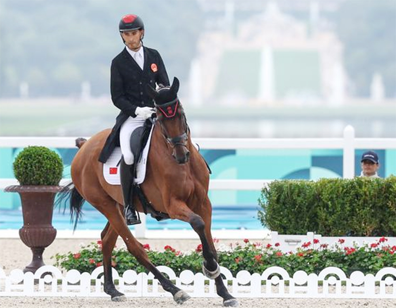 Atlet equestrian (ketangkasan berkuda) China Hua Tian tampil dalam nomor tunggang serasi (dressage) perorangan trilomba (eventing) di Olimpiade Paris 2024 di Chateau de Versailles di Paris, Prancis, pada 27 Juli 2024. (F. Xinhua/Yang Lei)