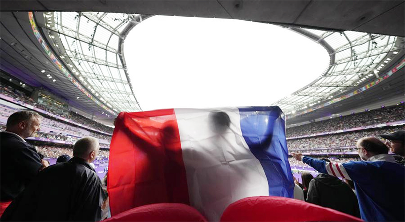Penonton menyemangati tim Prancis, saat pertandingan babak semifinal cabang olahraga rugbi tujuh orang (rugby sevens) putra antara Afrika Selatan melawan Prancis di Olimpiade Paris 2024 di Stade de France di Paris, Prancis, pada 27 Juli 2024. (F. Xinhua/Lui Siu Wai)