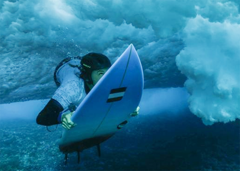 Atlet Prancis, Johanne Defay menyelinap melewati ombak (duck dive) saat sesi latihan selancar di Teahupo’o, di Pulau Tahiti, Polinesia Prancis, pada 26 Juli 2024, menjelang Olimpiade Paris 2024. (F. Xinhua/POOL/Ben Thouard)