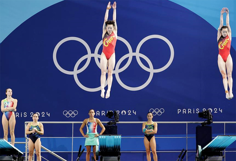 Pasangan atlet loncat indah China Chang Yani (kanan)/Chen Yiwen melakukan pemanasan sebelum babak final nomor papan 3 meter sinkronisasi putri di Olimpiade Paris 2024 di Saint Denis, dekat Paris, Prancis, pada 27 Juli 2024. (F. Xinhua/Zhang Yuwei)