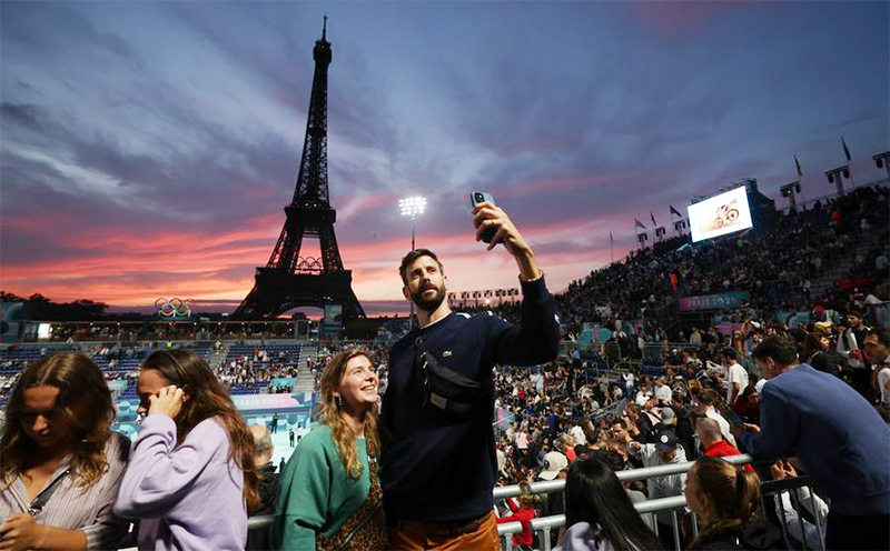 Sejumlah penonton berswafoto sebelum pertandingan fase penyisihan cabang olahraga bola voli pantai Grup B putri di Olimpiade Paris 2024 di Paris, Prancis, pada 27 Juli 2024. (F. Xinhua/Huang Zongzhi)