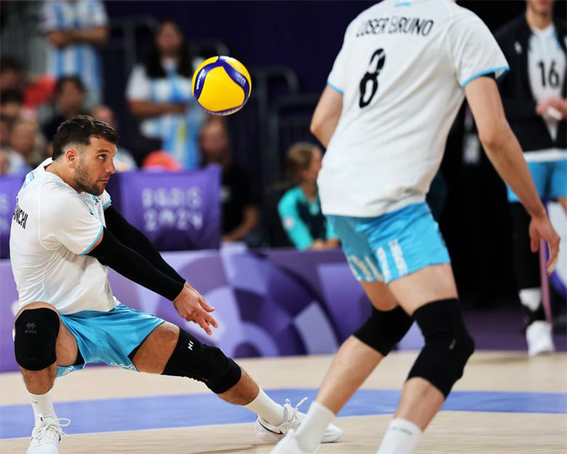Pemain tim Argentina, Jan Martinez Franchi (kiri) tampil dalam pertandingan babak penyisihan cabang olahraga bola voli Grup C putra antara Amerika Serikat melawan Argentina di Olimpiade Paris 2024 di Paris, Prancis, pada 27 Juli 2024. (F. Xinhua/Li Gang)