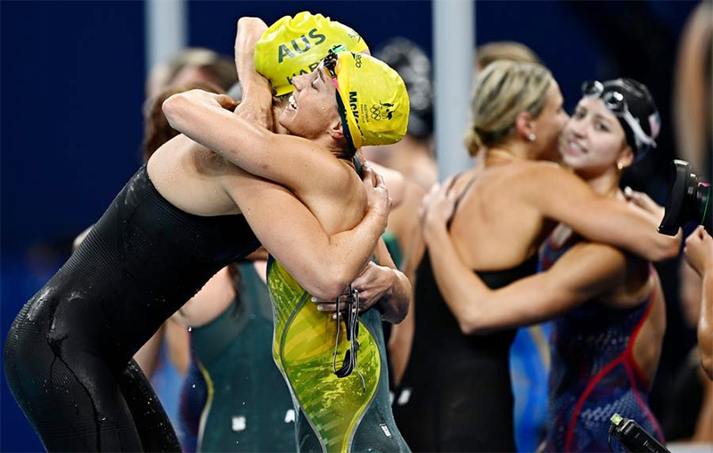 Tim Australia melakukan selebrasi usai babak final cabang olahraga renang nomor 4 x 100 meter estafet gaya bebas putri di Olimpiade Paris 2024 di Paris, Prancis, pada 27 Juli 2024. (F. Xinhua/Wang Peng)