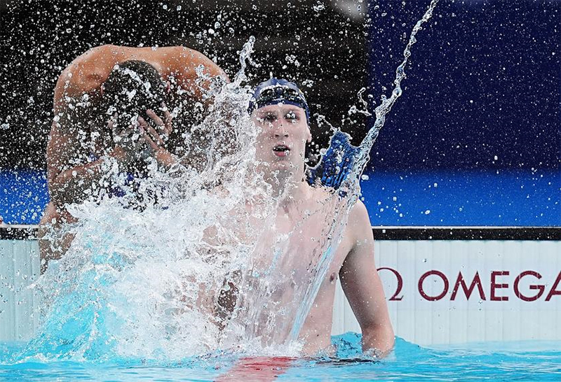 Atlet renang Jerman, Lukas Maertens (kanan) melakukan selebrasi usai babak final nomor 400 meter gaya bebas putra di Olimpiade Paris 2024 di Paris, Prancis, pada 27 Juli 2024. (F. Xinhua/Du Yu)