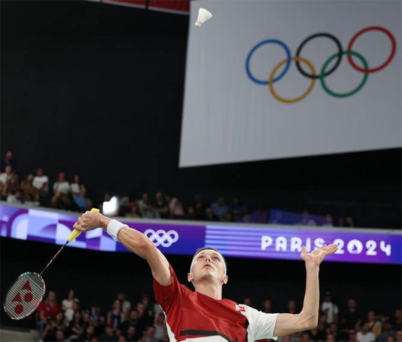 Pebulu tangkis Denmark, Viktor Axelsen tampil melawan Prince Dahal dari Nepal dalam pertandingan babak penyisihan grup P tunggal putra di Olimpiade Paris 2024 di Paris, Prancis, pada 27 Juli 2024. (F. Xinhua/Chen Bin)