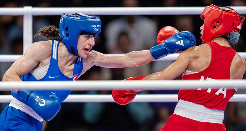 Atlet tinju Italia, Alessia Mesiano (kanan) tampil melawan Gizem Ozer dari Turki dalam pertandingan babak penyisihan 32 besar kelas 60 kg putri di Olimpiade Paris 2024 di Paris, Prancis, pada 27 Juli 2024. (F. Xinhua/Jiang Wenyao)
