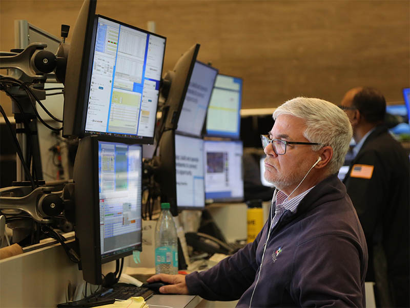 Seorang pialang saham bekerja di lantai perdagangan (trading) di Bursa Efek New York (New York Stock Exchange/NYSE) di New York, Amerika Serikat (AS), pada 21 Agustus 2024. (F. Xinhua/Liu Yanan)