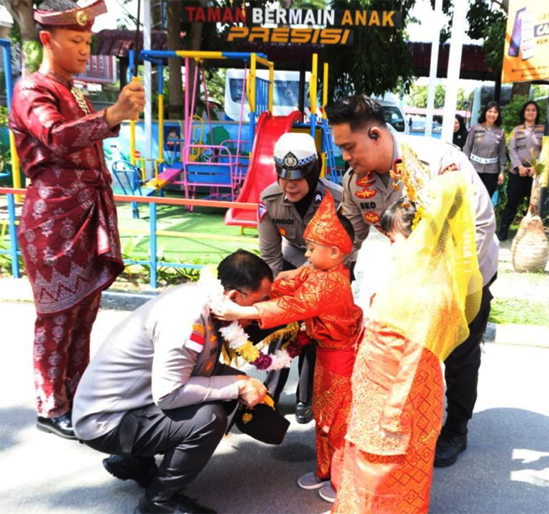 Meskipun bocil yang mengalungkan bunga, Kapolda Kepri berjongkok dan membukakan topi yang menutupi kepalanya. Sehingga, bocil tersebut jangkauannya sampai mengalungkan bungan ke pria bintang dua di pundaknya itu.