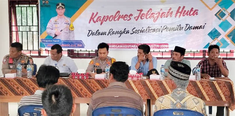 PALUTA (Kepri.co.id) – Kapolres Tapanuli Selatan (Tapsel), AKBP Yasir Ahmadi SIK MH yang diwakili Waka Polres Tapsel, Kompol Rapi Pinakri SH SIK mensosialisasikan pemilu damai, bertatap muka warga Desa Parsarmaan, Kecamatan Portibi Kabupaten Padang Lawas Utara (Paluta) di Aula Balai Desa Parsarmaan, Jumat (30/8/2024).