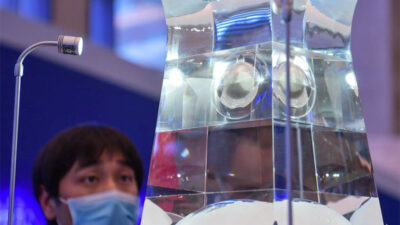 Seorang pengunjung mengamati sampel Bulan yang dibawa pulang wahana antariksa China, Chang’e-5 di Museum Nasional…